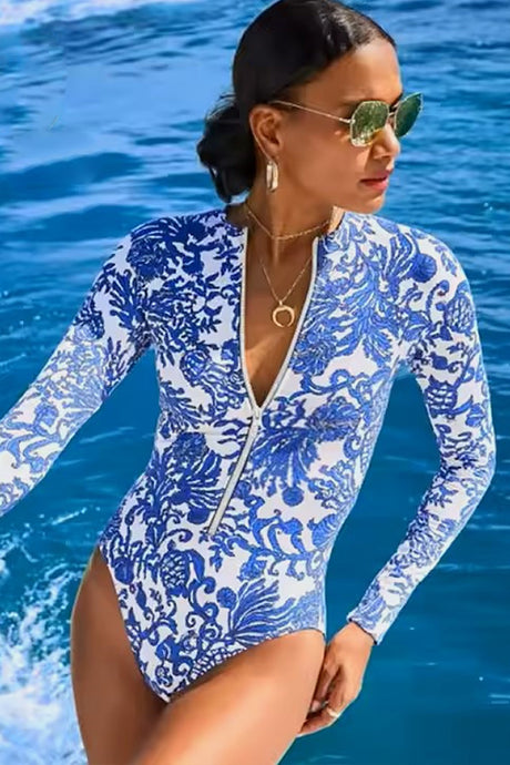 $39.99Grundpreis /Nicht verfügbarNavy Blumengedruckte Hochnacken -Reißverschluss Zwei Stücke Langarm UPF50+ Hautausschlag Wache