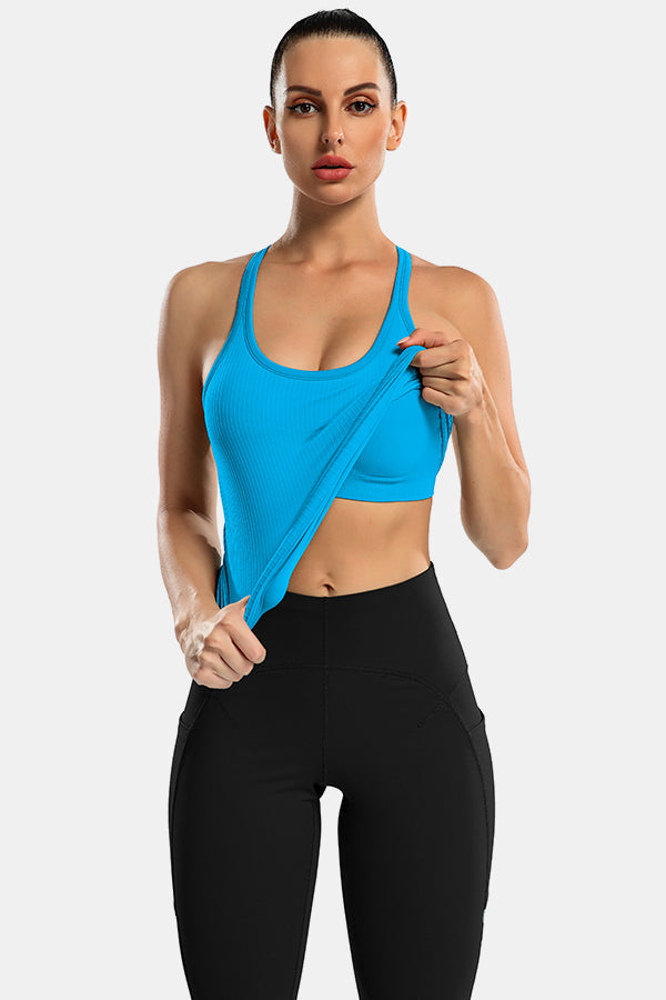 Blue Racerback Scoop Neck Athletic Top Hip Length Ribbed Workout Tank Tops
