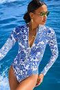 One-Piece Swimsuit With Zipper And Blue Willow Print UPF50+ Rash Guard