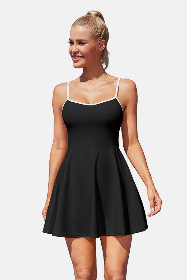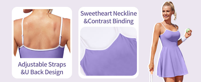 This golf dress that features a contrast binding sweetheart neckline.This design not only enhances your body curves but also adds a fashionable touch to your look. The bra is equipped with an elastic band and adjustable shoulder straps,allowing you to customize the fit and enjoy modest support during your activities. The fabric is made from lightweight, breathable, stretchy fabric. It has moisture-wicking properties to keep you dry and comfortable during your workout.