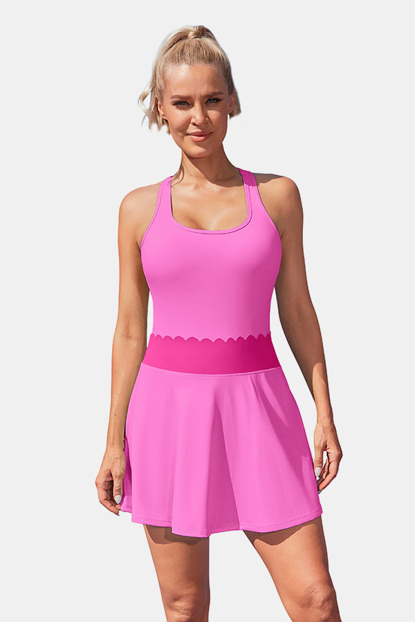 Women's Tennis Dress with Built-in Shorts Scalloped Pink Golf Dress Racerback Athletic Skirts