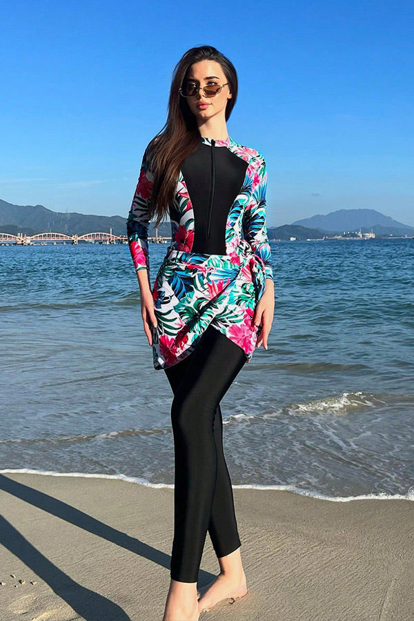 Muslim Modest Contrast Floral Print Long Sleeve Burkini Set UPF50+ Rash Guard With Skirt And Pants