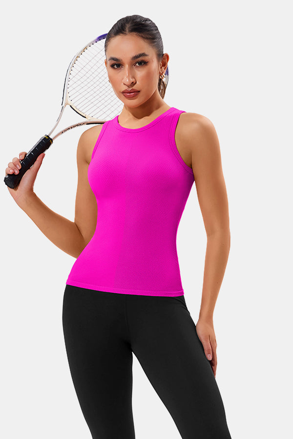 Neon Pink High Neck Full Back Seamless Tight Fit Ribbed Tank Top