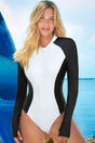 Rencontrez votre jeu de plage avec notre Rash Guard minimaliste à manches longues noir et blanc. La palette de couleurs noire et blanche intemporelle de cette garde éruption respire l'élégance et le style, ce qui en fait un ajout incontournable à votre collection de maillots de bain. Le tissu super-extensible offre un ajustement confortable et sûr, tandis que la cote UPF50 vous protège des rayons nocifs du soleil. Que vous surfiez, nagez ou participiez à d'autres activités sportives en plein air, ce protège-éruption est parfait pour vous.