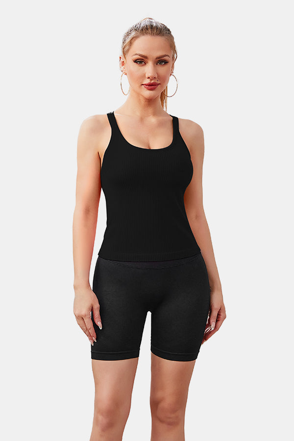 Black Scoop Neck Racerback Waist Length Ribbed Workout Crop Tops Tank Top